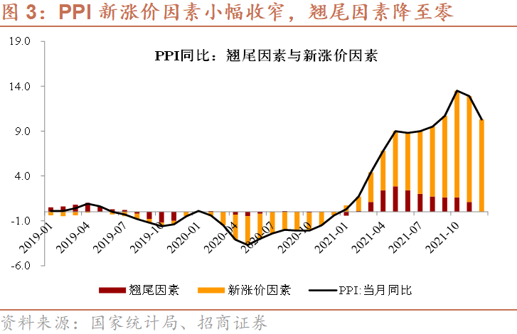 PPI将因基数因素而快速回落。PPI基数因素将从Q1的8.1%附近迅速降至Q4的-0.8%,在保供稳价政策下,这决定了全年的下行趋势。预计2022年PPI最高在2022Q1的8.4%左右,2022Q4降至0.4%左右,全年约4.2%。