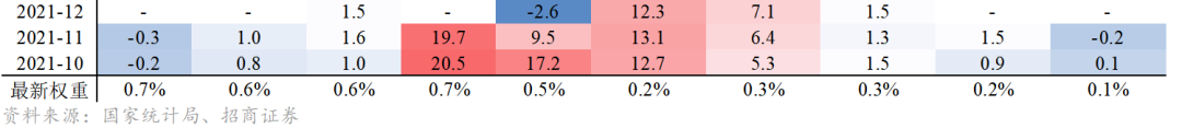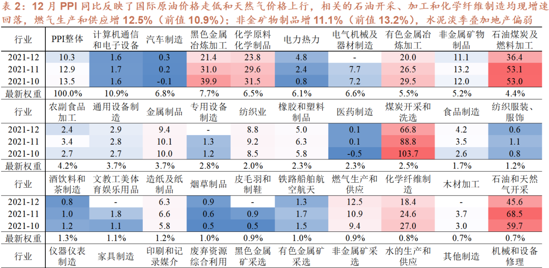 12月PPI同比反映了Omicron对国际原油价格的冲击、欧洲能源紧张导致天然气进口价格上涨、多省电价上浮,以及建筑业的前景平淡。12月PPI同比增10.3%(前值12.9%),全部由新涨价因素贡献。其中,石油开采、加工和化学纤维制造均现增速回落;燃气生产和供应增12.5%(前值10.9%);10月发改委发布深化燃煤发电上网电价市场化改革的通知以后,多省扩大电价浮动范围,PPI电力热力同比增4.8%(前值2.4%);非金矿物制品增11.1%(前值13.2%),尽管电价成本上浮,水泥价格仍持续下行,房地产需求趋弱、基建尚未对冲。