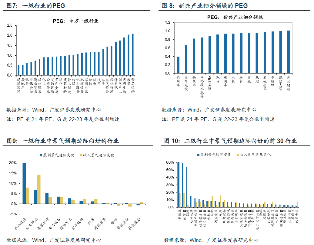 其中,广发策略认为,22年是盈利的下行期与美债利率中枢抬升的一年,对于增长G和估值的两端各有约束,因此今年PEG思路占优。目前低区“稳增长”链条22年PEG较低的二级行业是基础建设、保险、装修装饰、消费建材。PEG占优的新兴产业为新能源整车(商用+乘用)、光纤光缆、PET基膜等。