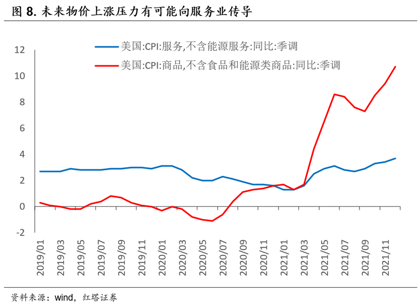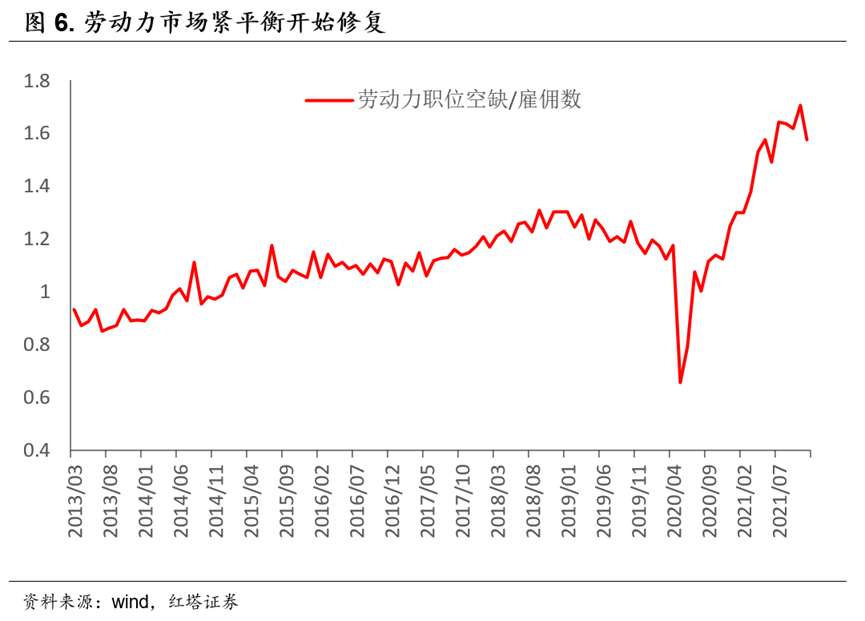 但当前随着劳动力市场开始修复,出行常态化,未来的通胀压力是属于服务环节的,而服务领域的物价上涨压力是需要货币政策加以控制的。