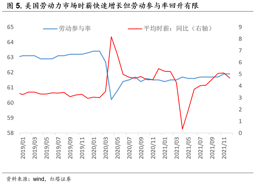 于是在当前的时点,对美联储来讲,主要矛盾发生了变化:之前需要一个相对过热的经济环境,吸纳“躺平”的劳动力,而现在因疫情冲击减弱,劳动力市场有自发修复的动能,美联储需要控制工资-通胀螺旋,避免过高的劳动力成本对企业复苏产生不利的冲击。