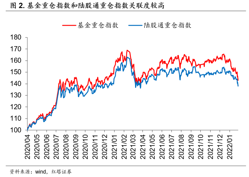 从历史数据上看,北上资金偏爱的标的和内资机构重仓的标的有较强的相关性,比如陆股通重仓指数和基金重仓指数在走势上相关性是比较高的,相关系数甚至高达99%。