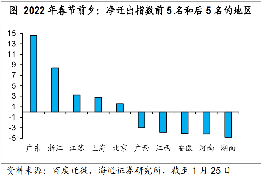 从百度迁徙指数看,截至1月25日,广东、浙江、江苏等发达地区的净迁出规模较高,并且主要返向湖南、河南、安徽等地区。这符合往年的春运规律。