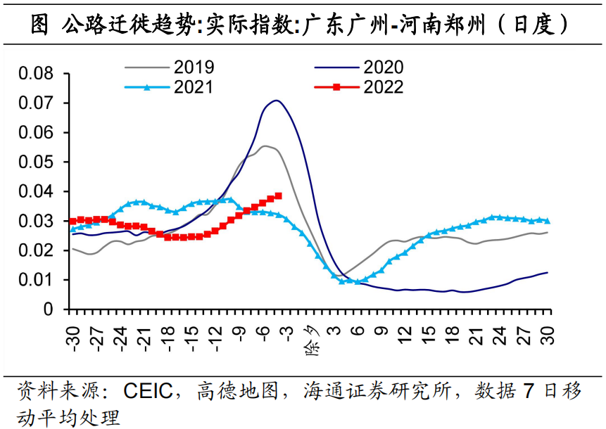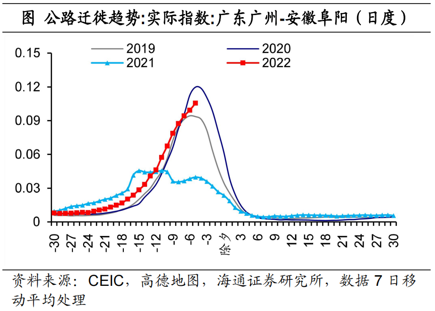 我们进一步借助高德移动趋势数据发现,今年春节前夕,从广州到阜阳的迁徙规模明显多于去年同期,甚至一度高于疫情之前。但是从广州到郑州的迁徙活动度相对偏弱,与疫情前的差距较为明显,并且节奏相比往年有所偏慢。这说明尽管个别地区农民工输出较多,但是因受疫情的影响,使得外地的返乡偏弱,体现了因城施策的效果。