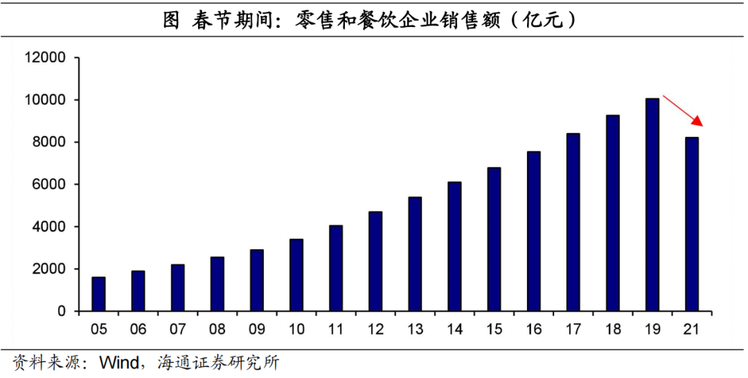 往年春节期间,消费通常会迎来旺季。但是去年,由于返乡人群大幅减少,消费需求被相应削弱。2021年春节假期,零售和餐饮企业的销售额仅为8210亿元,相比2019年下降18.3%。考虑到今年春节返乡规模或强于去年,“就地过年”对消费的负面影响可能减弱,但消费和疫情前相比可能依然存在较大差距。