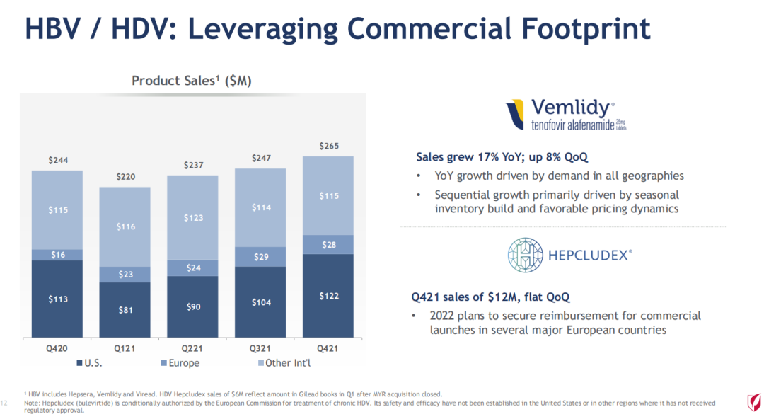 HBV/HDV吉利德具有传统优势的抗感染业务领域中唯一实现增长的方向,主要得益于乙肝新药Vemlidy 的需求增加以及Hepcludex 在欧洲的推出。