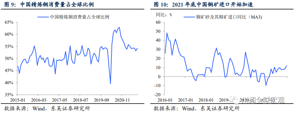 2021年可能是特例,中国经济的“铜含量”依旧高,而且可能更高。2021年中国经济在结构性调整下动能放缓,无论是精铜消费占比还是铜矿进口增速都出现阶段性下滑,不过中国依旧是全球最大的铜消费国,而且随着稳增长政策的发力,无论是新、老基建的适度超前,还是地产稳销售、保竣工积极推进对地产后周期的支持,都会拉动铜需求的阶段性上升,这一点我们从2021年底铜矿进口增速的回升也能得到一些印证(图9和10)。