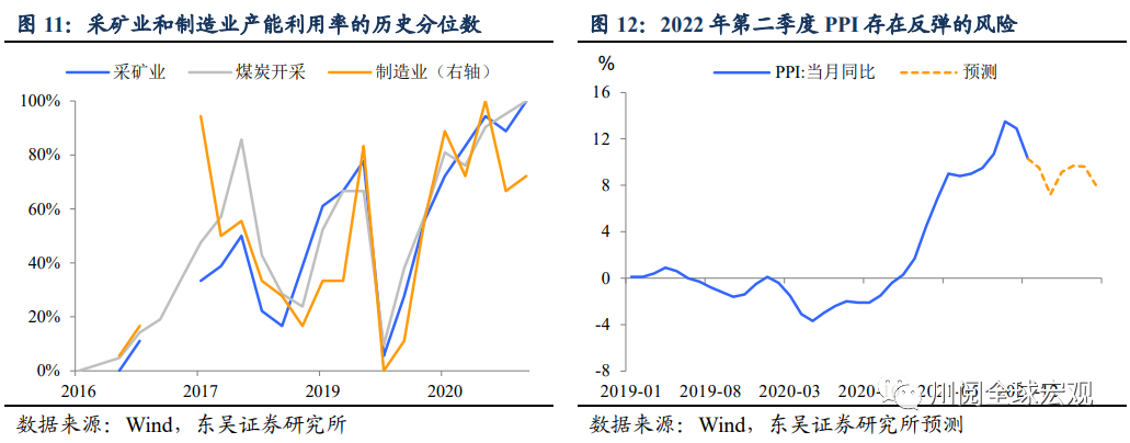 PPI“复燃”的风险主要在2022年第二季度。我们有望在第二季度看到全球大流行(pandemic)进入尾声,越来越多的经济体将开始明显放松疫情防控政策,需求正常化、中国经济加速企稳叠加2021年第二季度的基数效应,PPI有可能出现明显反弹(图12)。
