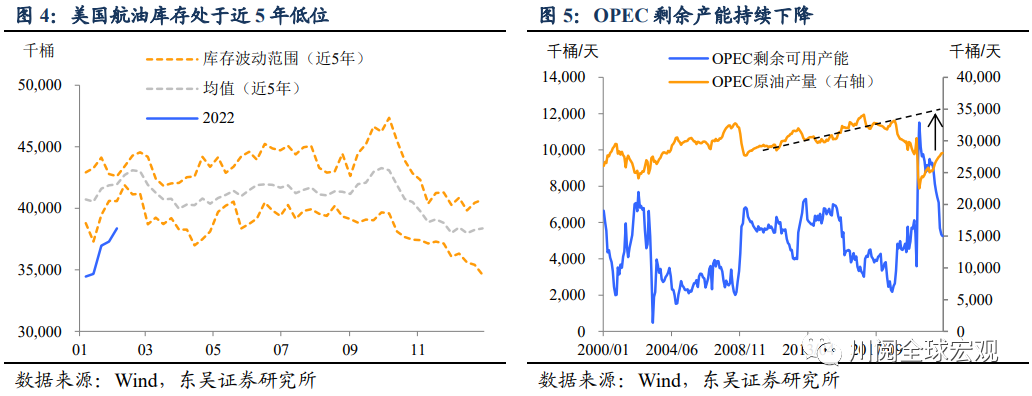 从库存和产能上看,全球应对这一需求上升的准备是不足。库存上,截至2022年2月全球原油库存依旧明显低于近5年(2017年至2021年)同期水平。而可能更值得注意的是原油供给产能的不足,疫情以来,OPEC的剩余产能还是美国页岩油的未完工油井(Drilled but Uncompleted Wells,DUCs)都出现明显下降,叠加此前低油价带来的低投资率,这将明显限制2022年原油供给的扩张。变数在于伊朗核协议的推进速度,如果伊朗原油产能重回全球市场,将阶段性缓解原油供需的不平衡。