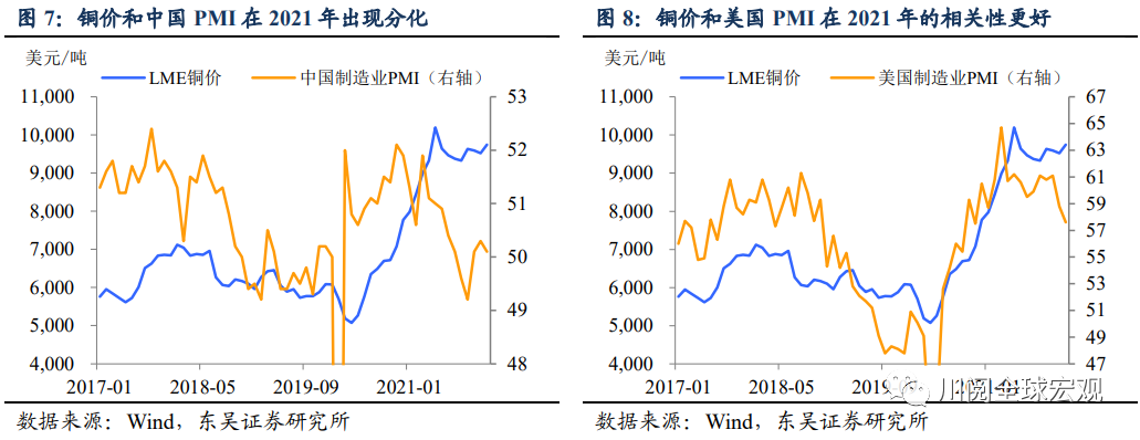铜的定价可能忽视了中国经济的企稳。2021年铜价走势和中国经济出现明显分化,反而和发达国家经济波动更加一致。其中一种解释认为2000年以来中国需求主导铜价走势的模式发生了变化,中国的影响在减弱,欧美经济在后疫情时代的复苏可能会在边际上主导铜价的变化。我们对这一观点持保留态度,我们依旧认为2022年中国经济在政策支持下的企稳会带动铜价上涨。