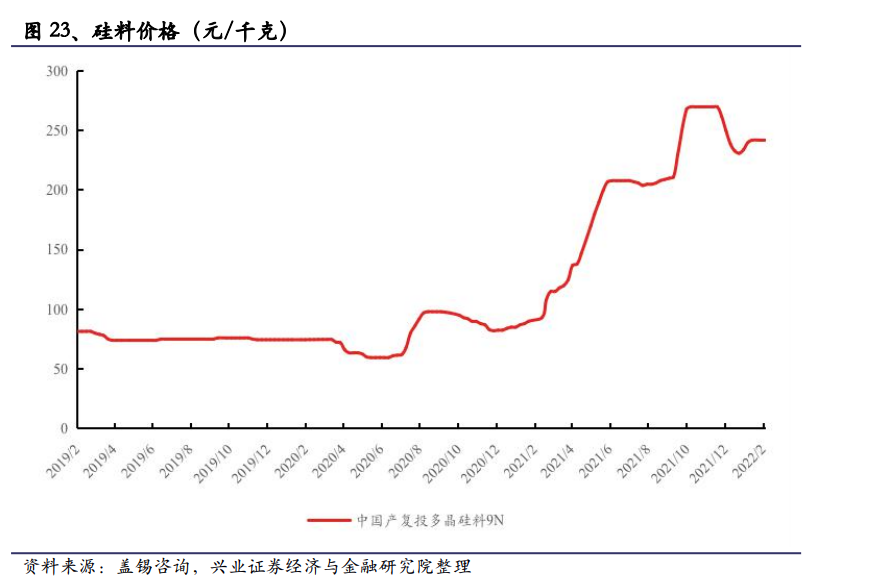 从上游材料来看,硅料价格自2021年2月以来开启趋势性上涨,近一年内累计涨幅已然翻倍,经历12月的下滑后,于近期再度开启涨势。