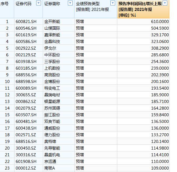 西南证券表示行业目前排产情况好,一季度有望超预期。据wind数据显示,在已公布2021年年报预告的光伏概念公司中,共计29家公司业绩预增,其中23家公司预告净利润增速超100%。