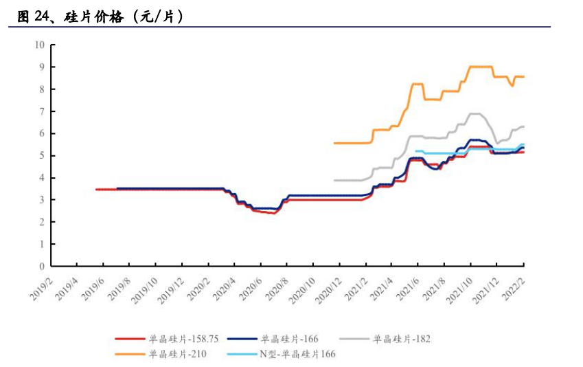 据国盛证券统计,2月单晶致密料240-245元/kg,环比涨3%,其认为,随着下游环节产能释放,硅料需求仍将有增无减,但硅料价格上涨向下游传导亦有一定压力,买卖双方仍在博弈中。受此影响,硅片也出现了涨价现象。
