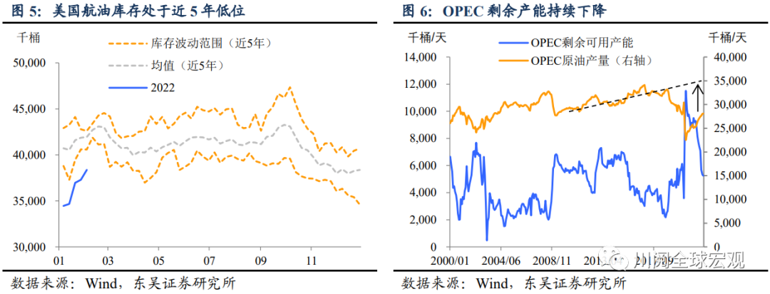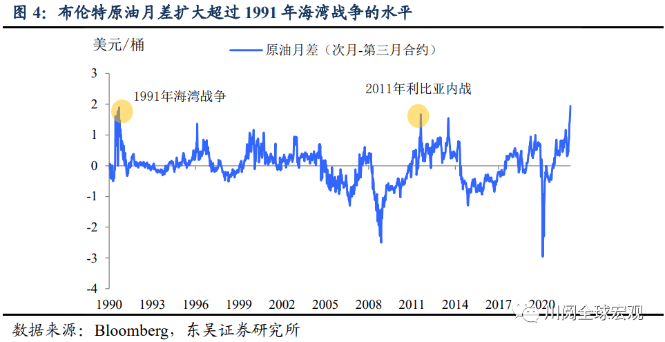 从供需角度看,2022年需求将延续复苏性增长。除了全球经济延续疫情后的复苏外,可能更重要的是“全球大流行(pandemic)”有望在今年结束(最早可能在上半年),经济回归正常化将进一步提振出行等相关原油需求,OECD对于2022年全球原油需求的估计很可能是偏低的。从原油期货的月差来看,地缘政治局势叠加夏季旺季需求,近月月差已经超过1991年海湾战争时期,虽然后续随着情绪性因素消退,月差回落会带来油价短线调整,但第二季度供需矛盾可能进一步加剧,继续支撑油价在100美元上方。