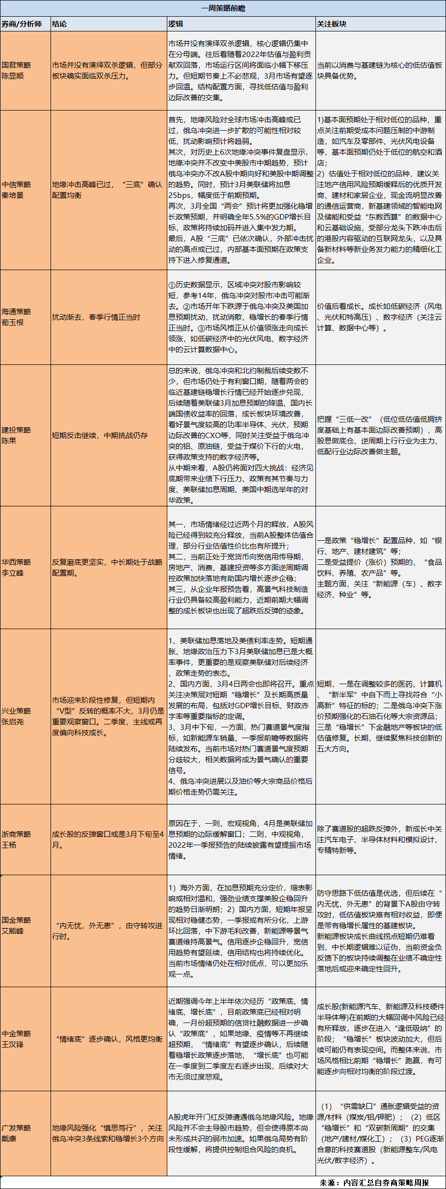本周分析师对于指数依旧看弱势震荡。而在看好的方向上,稳增长、低估值、成长风格、均衡配置各有不同,后续关注的焦点问题包括俄乌冲突进展、3月初的两会、3月中旬的美联储加息、全球大宗和通胀、3月下旬成长赛道部分行业的景气数据等。