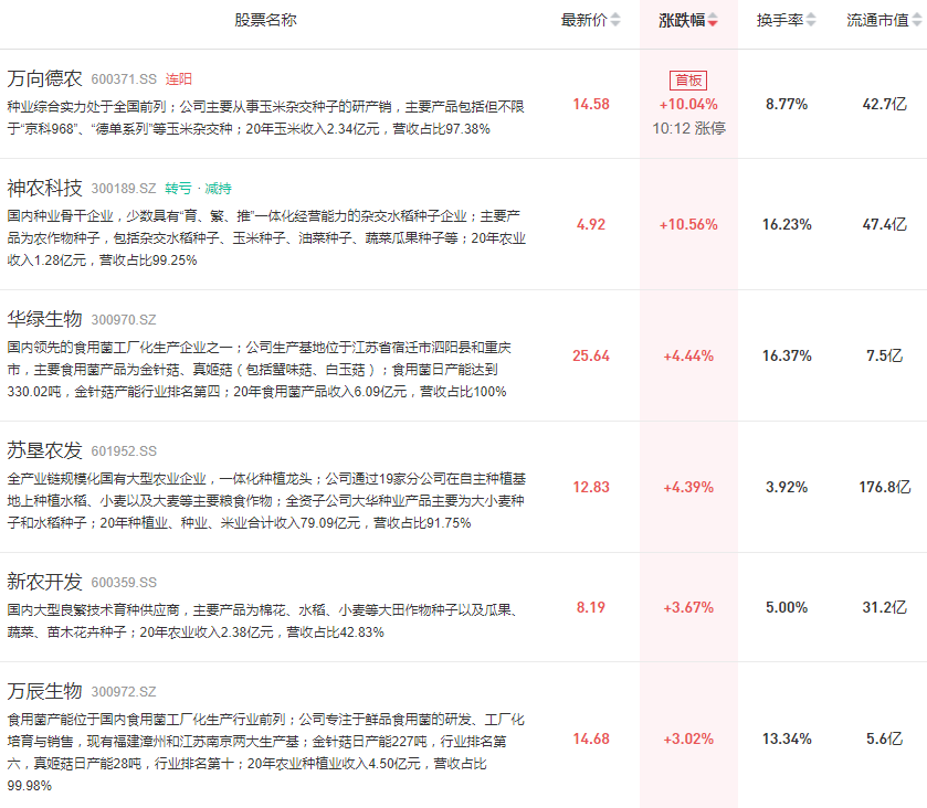 3月2日,农业板块一度拉升,万向德农涨停,创业板神农科技盘中一度20cm,苏垦农发、华绿生物等跟涨。