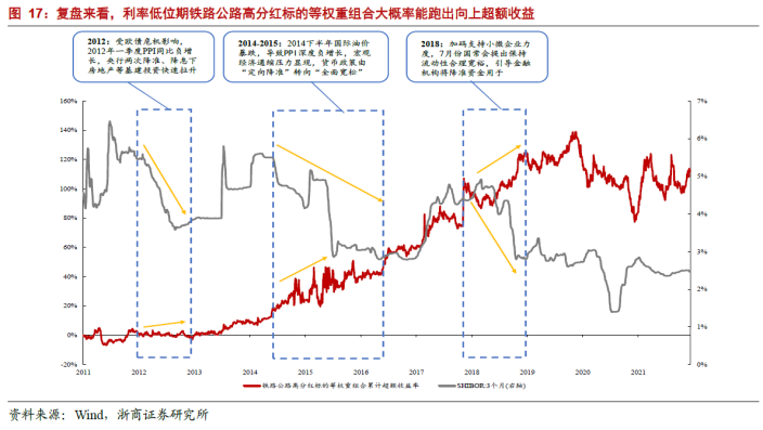 其选取高速板块5个高分红龙头标的及铁路货运龙头大秦铁路构建等权重股票组合,以2011年1月为时间起点进行回测,发现在以往流动性宽松期往往能够跑出正累计超额收益。