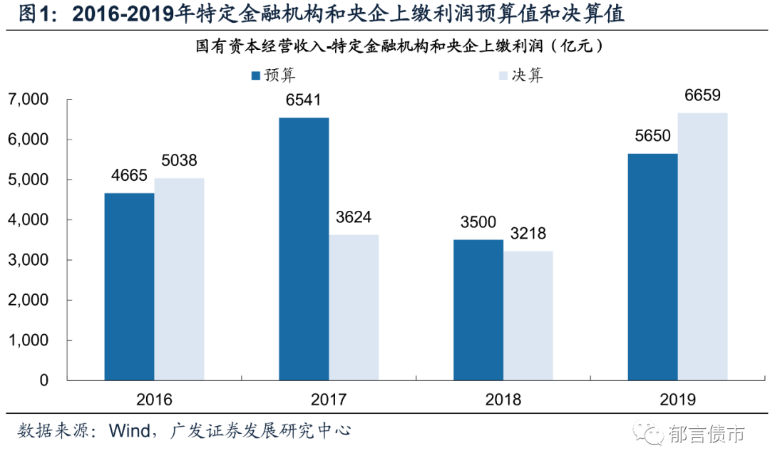 第三,“关于2018年中央和地方预算执行情况与2019年中央和地方预算草案的报告”中提到为支持实施大规模减税降费,要想方设法筹集资金,中央财政将增加特定国有金融机构和央企上缴利润。而“2019年中央一般公共预算收入决算表”中,非税收入项目下国有资本经营收入(特定金融机构和央企上缴利润)预算数为5650.00亿元,决算数为6659.03亿元。类似地,2016-2018年决算表中也存在类似科目,详见图1。