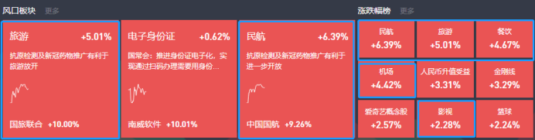 3月16日,旅游&民航&影视等后疫情概念集体大涨,国旅联合、曲江文旅、幸福蓝海等纷纷涨停。