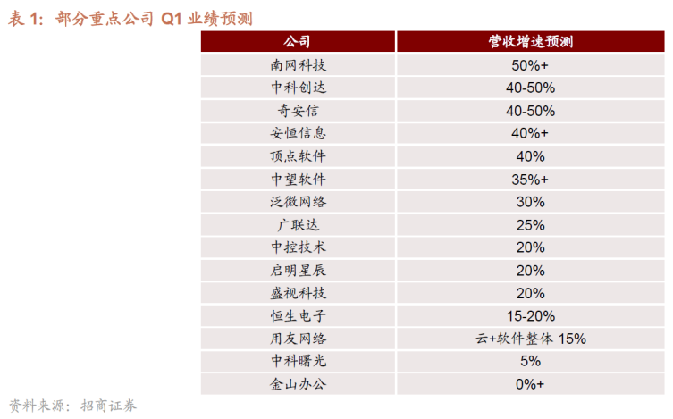 此外,华泰证券还对计算机行业各细分板块的一季报业绩分别做了前瞻预测,这里我们精选出其中高增长的细分,供大家参考。