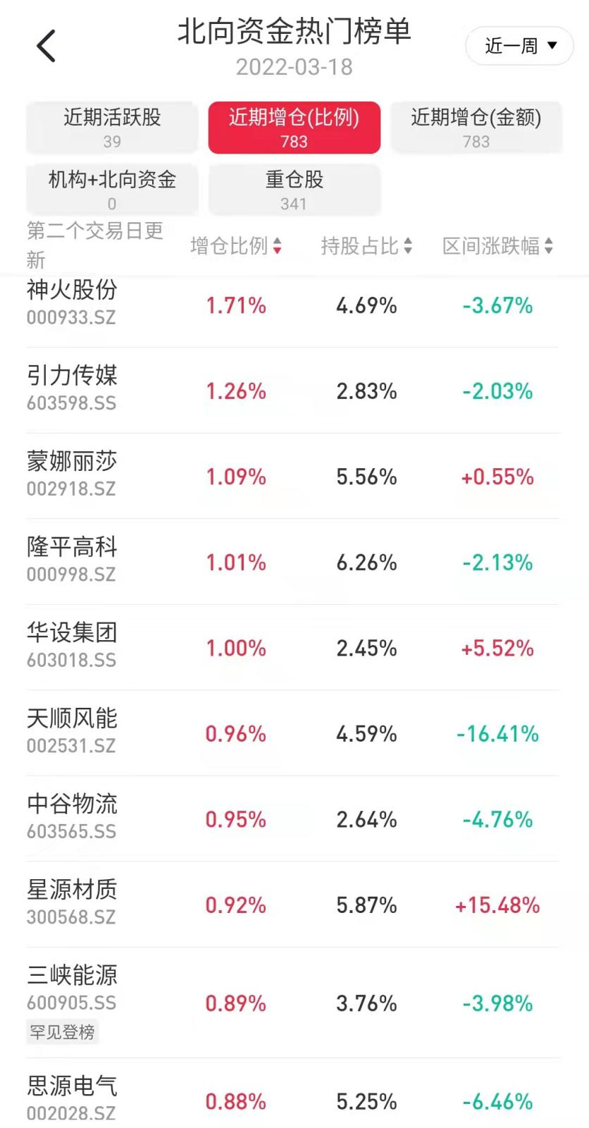 从增仓比例上看,上周外资合计加持783只个股,其中对5只个股增仓超1%,数量上较此前一周明显回升,但增仓比例却明显回落。