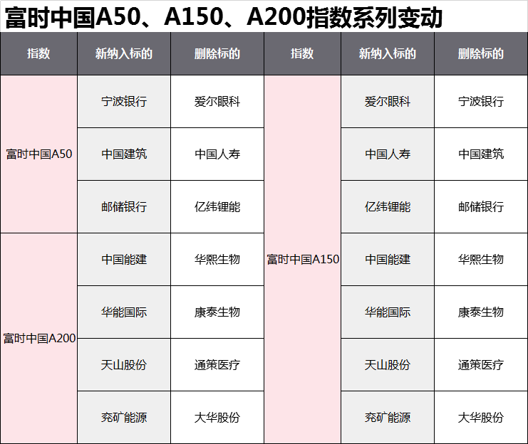 具体来看,富时中国A50、A150、A200共计新纳入14只标的、删除14只标的。
