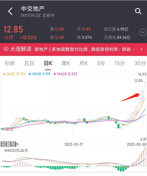 这里稍微提一下个股中交地产,近期它走得尤为强势,昨天地天板,然后今日集合竞价又直接被顶到涨停,近9个交易日大涨87.9%。