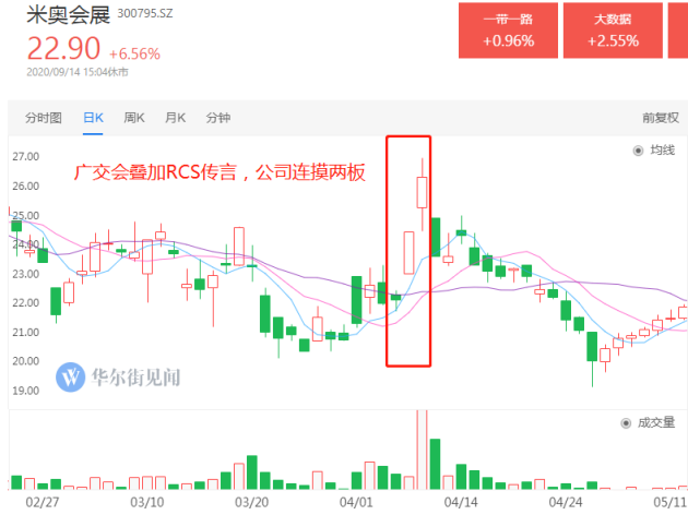 2020年4月,境外办展龙头米奥会展在互动平台上称:“RCS技术应用到公司业务上还处于尝试初级阶段,公司愿意与包括广交会在内的所有展会合作。”在此背景下,公司股价连续两日摸板。