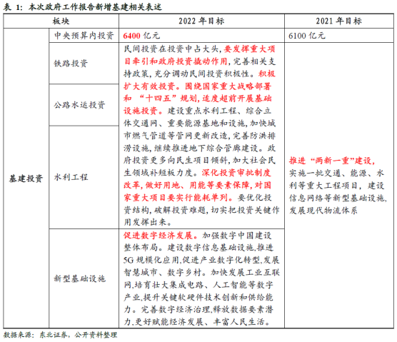 据东北证券梳理,今年的政府工作报告相比2021年,很大的一个看点就是今年报告新增对于基建投资细分领域的详细表述。