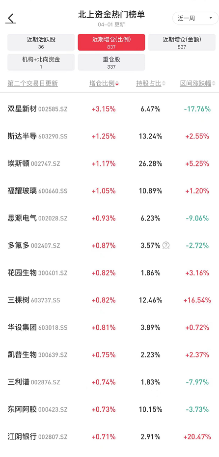 从增仓比例来看,上周北上资金大举增仓双星新材,增仓比例高达3.15%,远远领先其后的斯达半导(1.25%)和埃斯顿(1.17%)。