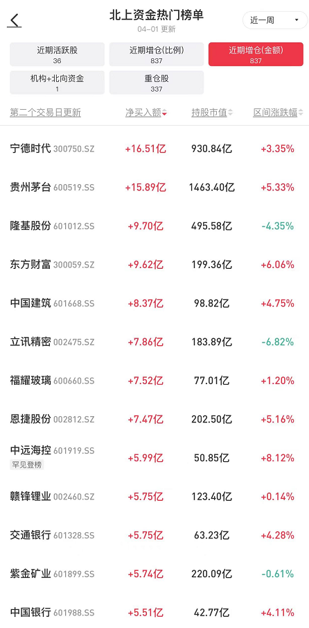 增仓金额来看,此前频频遭卖出的宁德和茅台重获青睐。两者双双获北上资金净买入16,51亿元和15.89亿元。