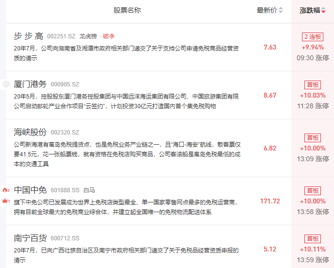 4月12日午后,免税店概念大幅走强,三千亿龙头中国中免封板,海汽集团、海峡股份等多股涨停。