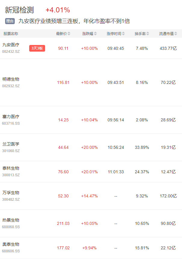 疫情概念股方面,新冠检测板块今日多股爆发,九安医疗3连板、明德生物、赛力医疗双双封板、兰卫医学、泰林生物、万孚生物悉数涨超10%。