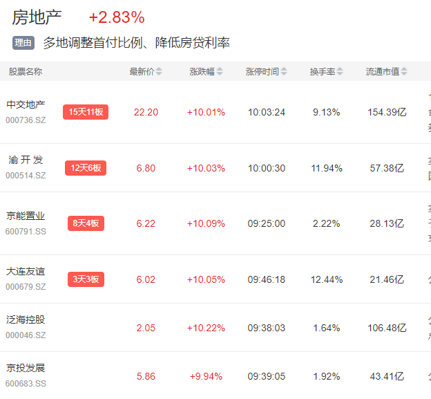 房地产板块在涨停股数上今日继续领涨两市,中交地产15天11板、后排渝开发、京能置业、大连友谊等悉数涨停。