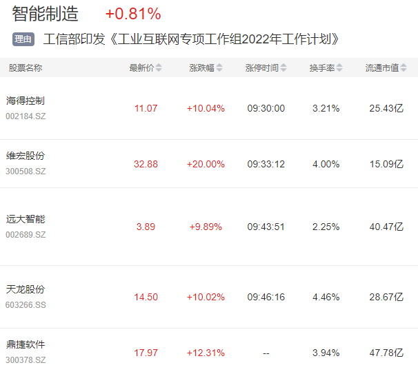 智能制造板块今日继续走强,维宏股份20cm涨停、海得控制、远大智能、天龙股份10cm涨停。