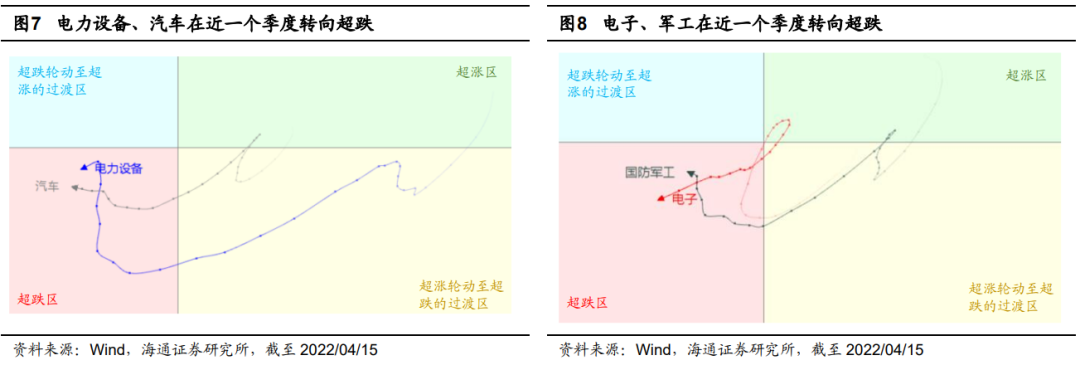 电子、汽车、电新和军工已明显超跌。从目前已经明显超跌的行业来看,电子、汽车、电新和军工的走势较为类似,在过去约半年时间维度均是经历了超额收益不断收窄,进而从超涨轮动至超跌的过程,目前这四个行业超跌的状态已经持续了约一个季度。