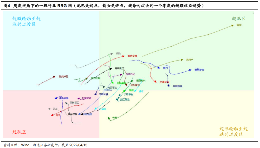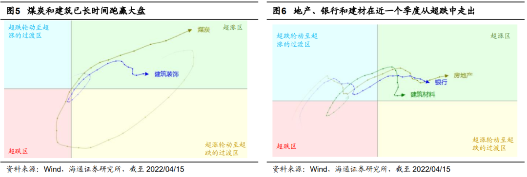 从细分行业来看,目前已明显超涨的行业为煤炭、地产链和银行。单独挑选已明显超涨的行业并将RRG图刻画的区间延伸至约半年的维度,可以发现各行业基本已经转过一个完整的圈。而其中煤炭和建筑对应的圆环基本维持在右侧(一四象限),意味着中期趋势的轮动累计起来后煤炭和建筑已在较长时间维度内跑赢大盘;而地产、银行和建材的圆环显示这些行业是在近一个季度才从超跌区域中走出,但由于在近期积累了较大幅度的超额收益,因此目前也处于明显超涨的区域。