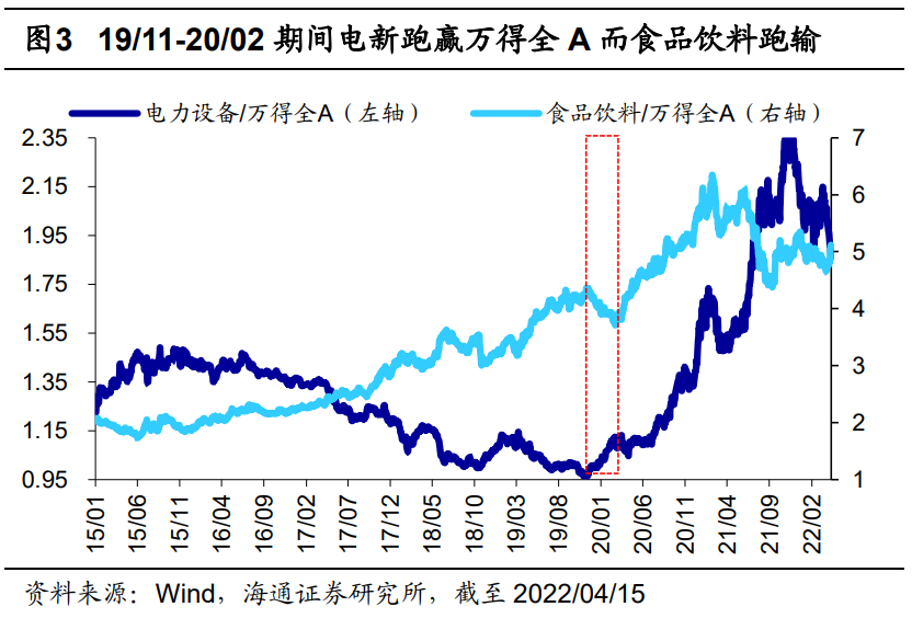 例如长期优于大盘指数的食品饮料板块在18/06-18/10期间跑输Wind全A 13个百分点,而前期持续跑输大盘的国防军工指数同期的超额收益为5个百分点;又比如19/11-20/02时食品饮料再次跑输万得全A 19个百分点,而电力设备指数虽然在16-19年时持续跑输大盘,但此时的超额收益达到了18个百分点。