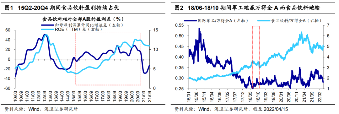 在进行行业比较时,盈利趋势是辨别行业长期强弱的重要依据。以食品饮料为例,可以发现食品饮料相比全部A股的相对盈利趋势在15Q2后迎来明显的拐点,食品饮料相对全部A股的归母净利润累计同比增速差从15Q2的-4.2%升至20Q4的14.1%,而同期ROE(TTM)的相对差值更是从3.8%一路攀升至12.4%,盈利持续占优的背景下食品饮料板块自15年下半年起长期跑赢大盘。
