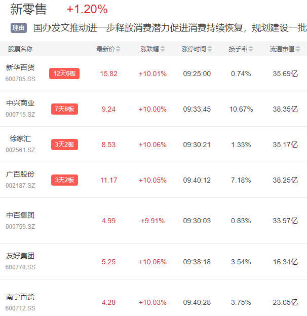 4月26日,免税概念+新零售早盘涨停股两市居首,中兴商业7天6板,新华百货3连板,徐家汇、中百集团、南宁百货等纷纷涨停。