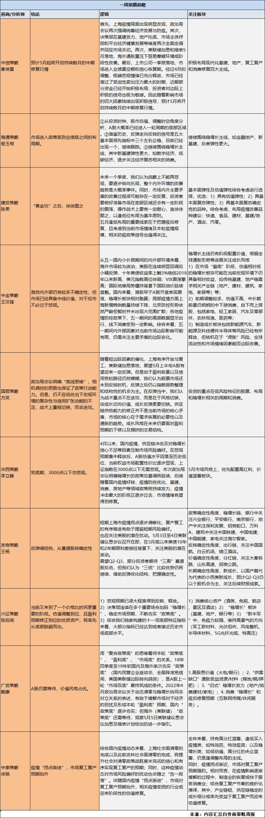 关于5月份行情展望,部分策略分析师认为或是中期修复的始点。同时也有声音指出战术上重视切换,而非进攻。方向上,复产复工、稳增长、消费等方向认可度高。