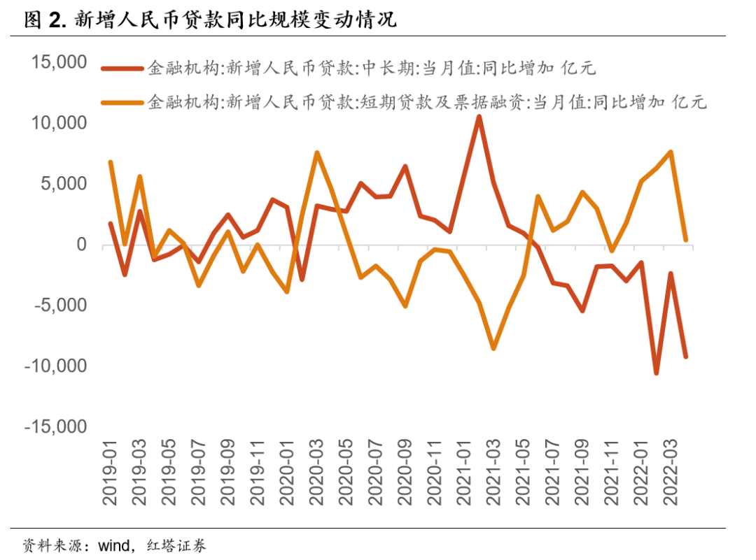 比如我们能够看到4月份人民币贷款增加6454亿元,同比少增8231亿元,其中居民部门信贷再度出现了负增长(减少2170亿元),票据融资成为企业信贷的主要支撑项等等。