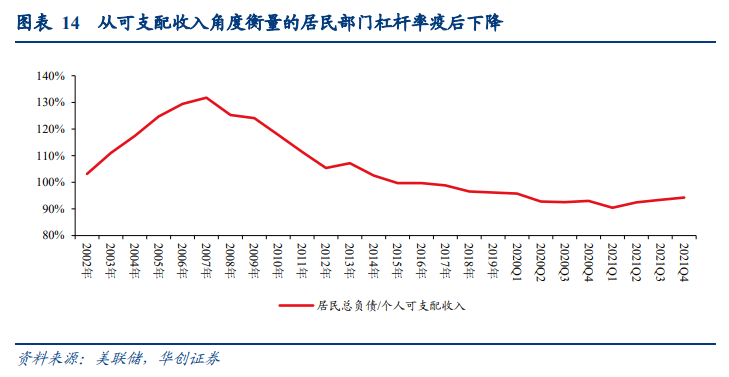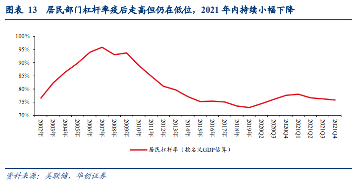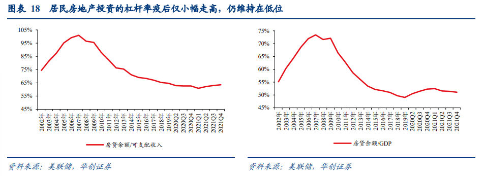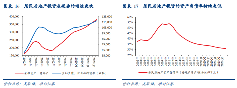 居民在疫情后,房地产投资杠杆率未见大幅抬升,地产投资领域债务健康度仍高。由于疫情后房价大幅走高,因此剔除价格的房地产投资流量表与未剔除价格的资产负债表之间差异较大。考虑到我们需要计算居民真实的债务负担,因此我们采用未剔除价格的资产负债表数据进行分析,可以看到:截至2021Q4居民房地产资产余额为38.1万亿美元,较疫情前(2019年末)增长8.1万亿美元,而这一过程中房地产抵押贷款仅新增1.3万亿美元左右。计算居民房地产资产余额/住房抵押贷款余额(居民持有房地产的资产负债率)也可见,疫后居民房地产投资的资产负债率持续走低,截至2021Q4已降至31%,相较金融危机前54%的峰值,目前居民房地产投资的资产负债情况依然健康。同样的,居民房地产投资杠杆率水平(以房贷余额/名义GDP一年滚动平均,房贷余额/可支配收入一年滚动平均衡量)在疫后仅有小幅走高。