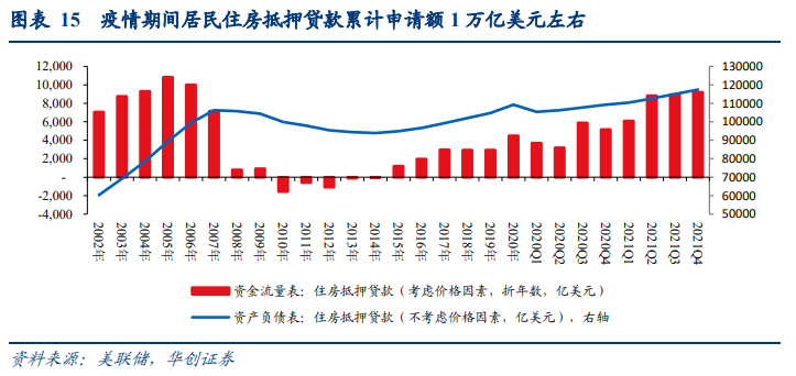 从Z.1表存量角度看(考虑价格因素),截至2021Q4,与疫情前2019年末相比,疫后居民住房抵押贷款增长1.27万亿美元左右。至2021Q4美国居民部门住房抵押贷款余额11.74万亿美元。由于抵押贷款受价格因素影响不大,因此流量角度与存量角度的数据基本一致。