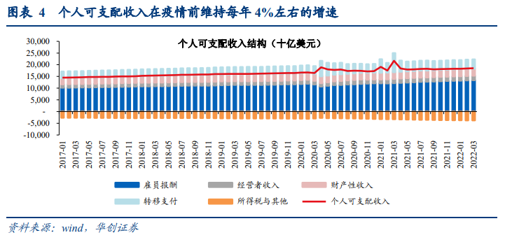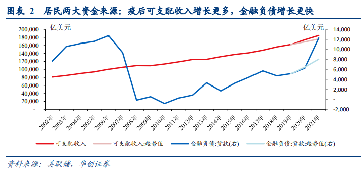 疫后居民部门最主要的“超额”资金来源是可支配收入(占比持续在90%以上),受益于财政补贴居民在疫情期间的可支配收入相较疫情前(2019年)水平累计多增约3.5万亿美元,相较历史趋势值“超额”可支配收入规模约1.4万亿美元。疫情前,居民可支配收入维持每年4%左右的增长,2019年年可支配收入达到16万亿美元。在疫情后,2020Q2起美国财政大规模发放补贴,家庭部门年可支配收入提升至18-19万亿美元以上,2021年居民可支配收入2年同比增速提升至6.8%。与2019年末相比,2020-2021年居民可支配收入相较2019年末累计多增约3.5万亿美元,正常年份中,两年可支配收入累计增长规模约2万亿美元左右;而相较可支配收入的历史增长趋势值,2020-2021年居民“超额”可支配收入规模约1.4万亿美元。