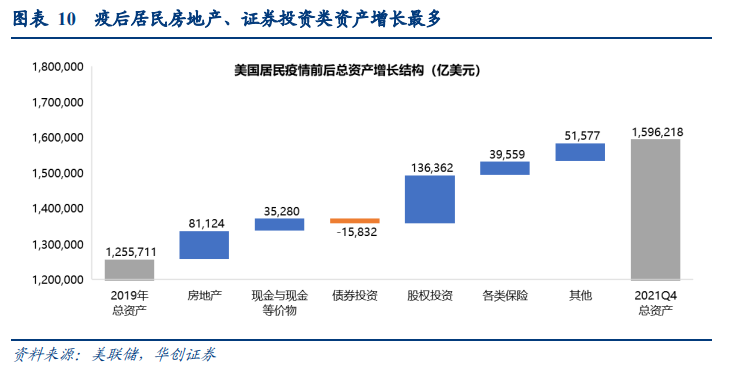 2)房地产:资产规模扩大8.1万亿美元至38.1万亿美元,剔除价格因素的流量数据显示疫情期间居民房地产累计投资额1.6万亿美元,因此居民房地产资产扩张也绝大部分来自房价的上涨。