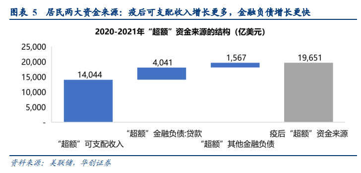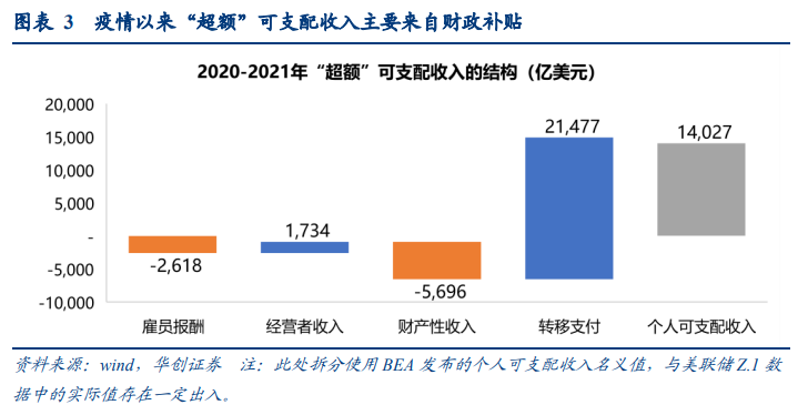 因此合计来看,疫情以来(2020-2021年),居民的资金来源相较历史趋势值合计多增近2万亿美元,其中“超额”可支配收入1.4万亿美元(疫情前每年可支配收入约16万亿美元,年平均增长4%),“超额”金融贷款4000亿美元(疫情前每年金融贷款约5100亿美元,年平均增长25%);1.4万亿美元的超额可支配收入中,2.1万亿美元来自财政补贴,几乎是疫后“超额”可支配收入的全部来源;而疫情前的可支配收入中70%则来自雇员报酬。