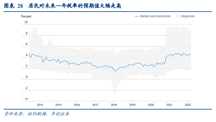 “李嘉图等价”效应可能进一步压制家庭的消费倾向。根据李嘉图等价的理论,居民更有可能选择节省由债务融资带来的政府转移支付,因为他们会预期到这部分转移支付在未来会通过更高的税收来弥补。而纽约联储对居民预期的调查显示,居民对未来一年税率的预期值大幅走高。因此对未来更高税率的预期可能会进一步压制家庭对超额储蓄的消费倾向。