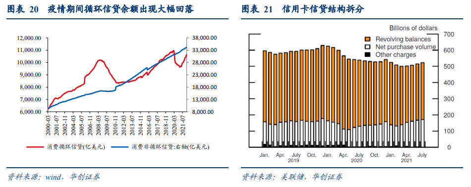 从更高频的信用卡信贷数据同样可以看到,疫情期间信用卡信贷也出现大幅回落,目前仍未恢复至疫情前水平。美联储月度发布美国消费贷款存量数据,周度发布商业银行消费贷款存量数据,其中由于商业银行是消费贷款主要的供应方之一,商业银行消费贷款存量数据略低于消费贷款整体数据,但走势基本一致。消费贷款可进一步拆分为:循环贷款(主要为信用卡贷款)、非循环贷款(主要为车贷、助学贷款等)。可以看到,疫情后非循环贷款维持疫情前增速不变,但循环贷款出现大幅回落,2021年4月起触底回升。