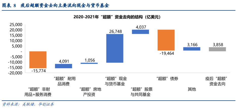 因此合计来看,疫情以来(2020-2021年),居民的资金去向相较历史趋势值合计多增近3900亿美元,其中“超额”现金与货币基金(超额储蓄)累计多增2.7万亿美元(疫情前每年现金与货币基金投资约-2000~2000亿美元),且现金与货币基金投资在疫情前仅占资金去向的-1%-3%左右,疫后占比提升至12%;“超额”耐用品消费累计多增4000亿美元(疫情前每年耐用品消费约1.4万亿美元,年平均增长4%),且耐用品消费在疫情前占资金去向的8%左右,疫后占比提升至10%;“超额”房地产投资累计多增1000亿美元(疫情前每年耐用品消费约7000亿美元,年平均增长8%),且房地产投资在疫情前占资金去向的4%左右,疫后占比提升至5%;而债券投资与非耐用品与服务消费则较疫情前累计减少1.9、1.6万亿美元。